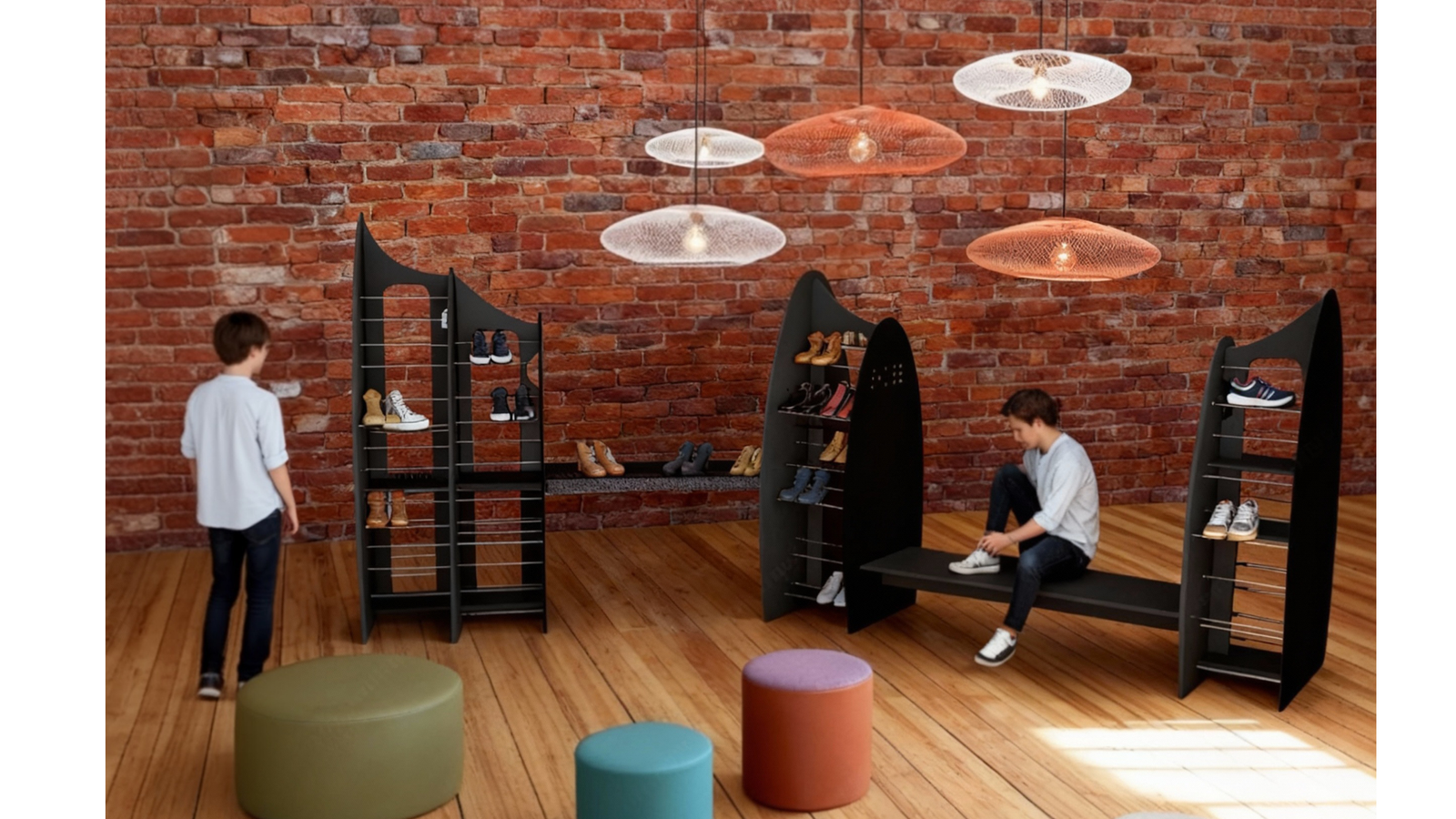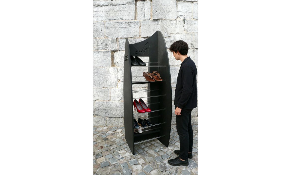 Le meuble à chaussures ouvert est en MDF noir et les chaussures reposent sur des tiges en plexiglas transparent. C’est un présentoir – un display pour les chaussures, c’est pourquoi il est devenu le display pour ce magasin de chaussures. Un circuit a été pensé avec des bancs pour les essais chaussures; Le banc suit le meuble auquel vient se greffer un nouveau meuble.
