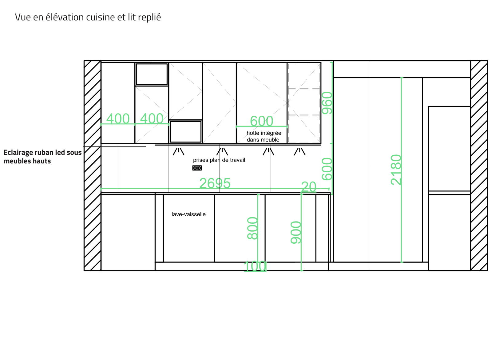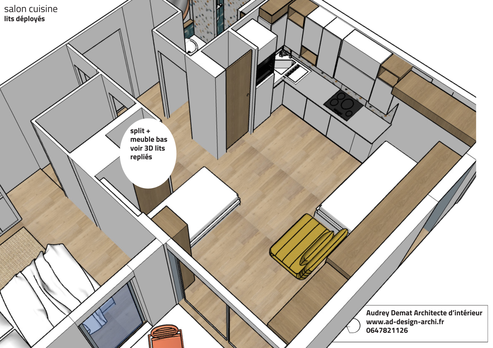 L’idée est de répartir les couchages aux deux opposés du séjour, dans des lits escamotables. Les ados auront chacun leur espace.