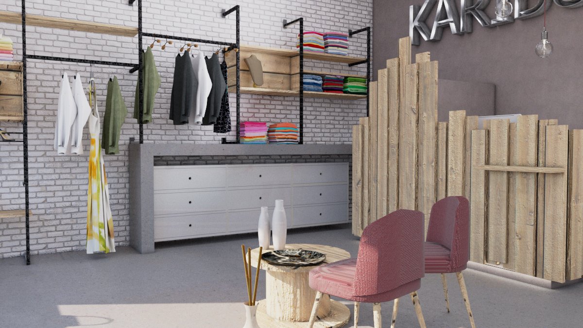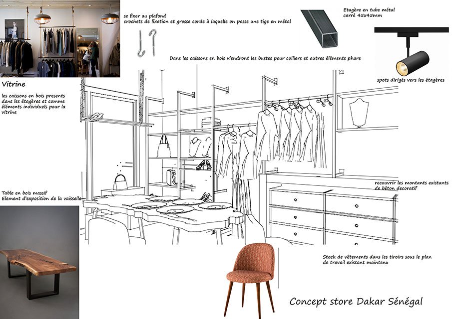 Nous sommes partis sur un style industriel. Le commerce est petit et s’articule autour d’une table centrale avec la poterie artisanale.  sur les rayonnages muraux en acier brute sont exposés les créations textiles. Au fond se trouve le module caisse et cabine d’essayage réalisé avec des planches brutes superposées et sur différentes hauteurs.